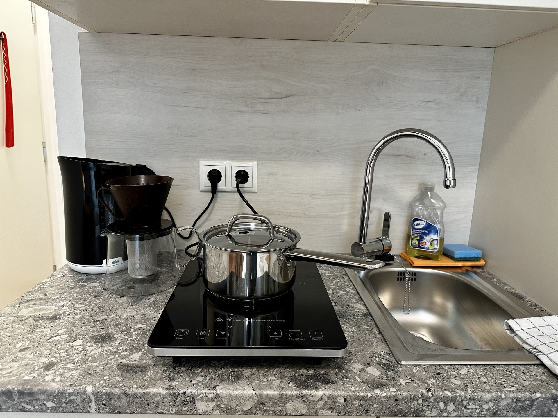Das Apartment verfügt über alle notwendigen Annehmlichkeiten für einen angenehmen Aufenthalt, einschließlich einer Küchenzeile, einem bequemen franz. Doppelbetttund einem kompakten Badezimmer mit Dusche.